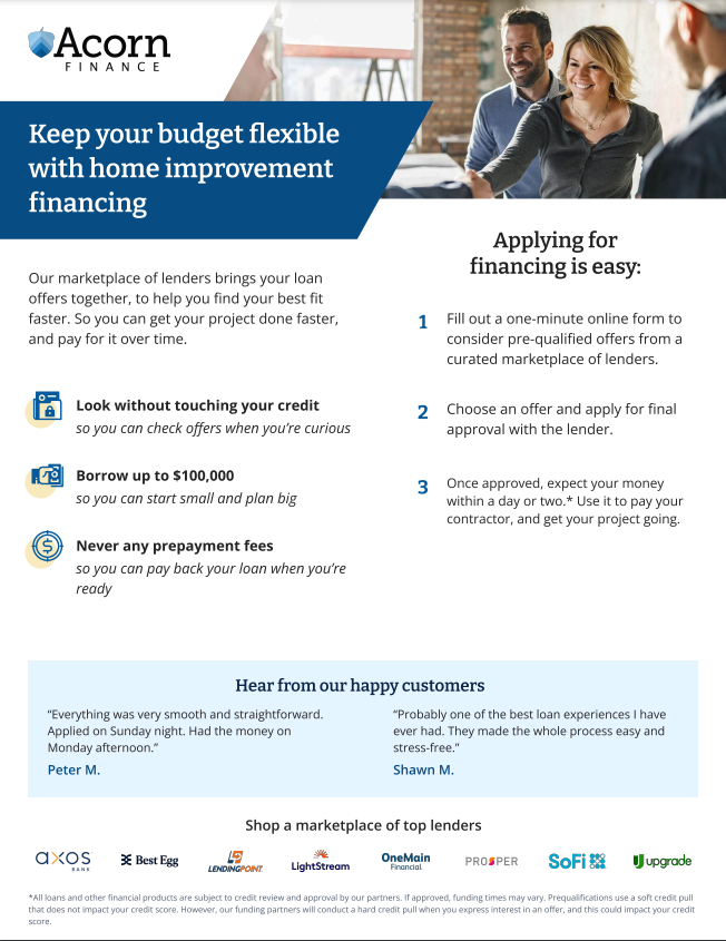 📌 Learn more about Acorn Financing. Download our Acorn Financing PDF to see how this integration can help your customers finance their projects with ease.