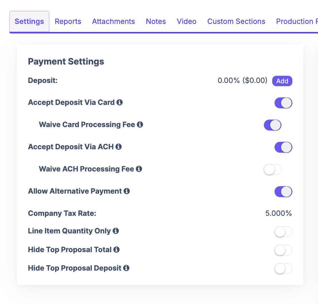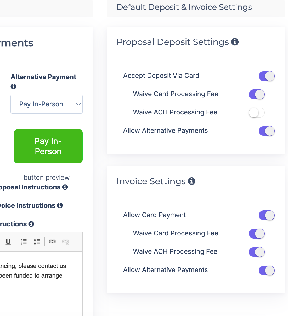 We’ve expanded your payment flexibility! Now, when you toggle these options on or off in your payment settings, these settings will automatically apply to your proposals and invoices, making transactions smoother than ever:
